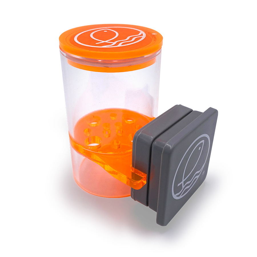 NEW from ESHOPPS The Color Series ALPHA Class we proudly introduce EZ FEEDER. EZ FEEDER allows you to easily defrost & feed your aquariums inhabitants in a convenient, secure location. EZ FEEDER is equipped with an o-ring sealed lid & strong anti-slip rubber padded magnet that holds max tank thickness up to 1/2” (12.5 mm). The sealed lid allows you to fully submerge EZ FEEDER for a slow release of food and allows bottom dwelling fish to feed easily. This simple but amazing product is constructed of high quality clear over neon orange colored acrylic. EZ FEEDER is a beautiful necessity for every aquarium hobbyist.